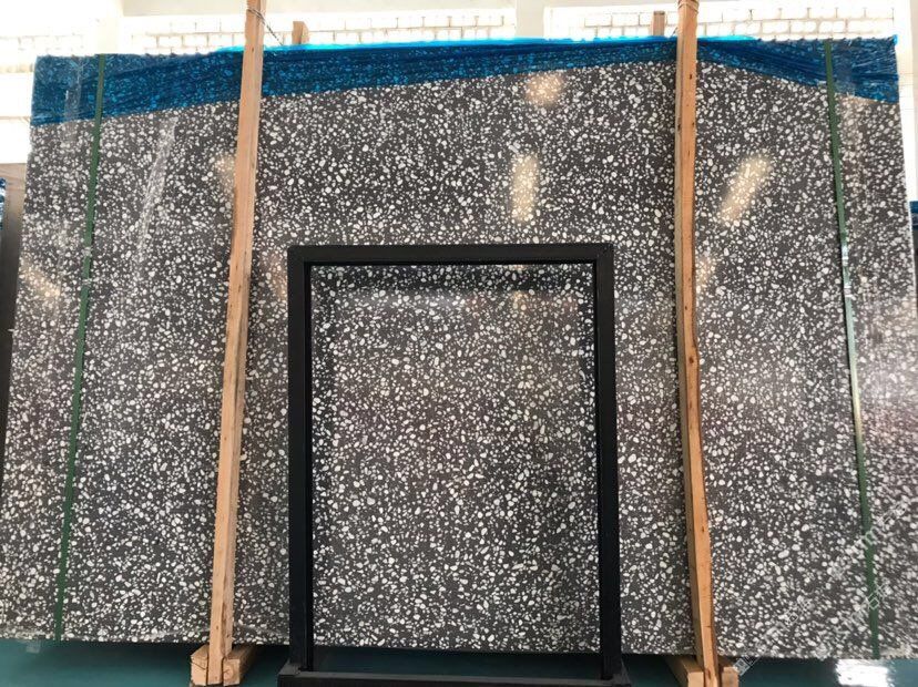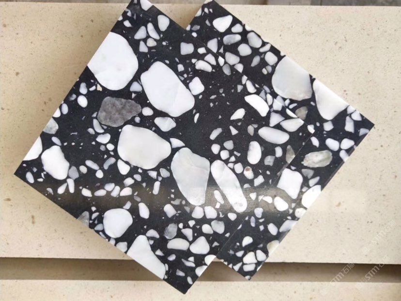 人造無機(jī)水磨石,生產(chǎn)主要原材料,天然礦石沙,高標(biāo)號(hào)白水泥和水,經(jīng)過先進(jìn)制作工藝流程壓制成型荒料,再根據(jù)工程設(shè)計(jì)厚薄規(guī)格切割成大板。