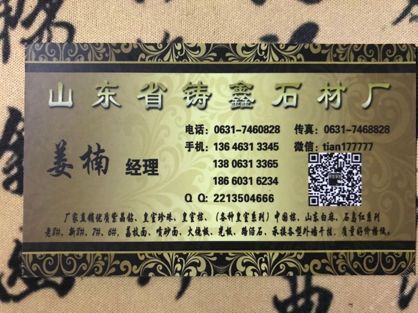 中國山東威海您好我是山東省榮成市石島紅產(chǎn)地鑄鑫石材有限公司公司成立于1992年主要經(jīng)營:石島紅老8#新8#7#6#皇室系列紫晶鉆白麻榮成灰等優(yōu)質(zhì)產(chǎn)品,A級荒料火燒板光板荔枝面復古