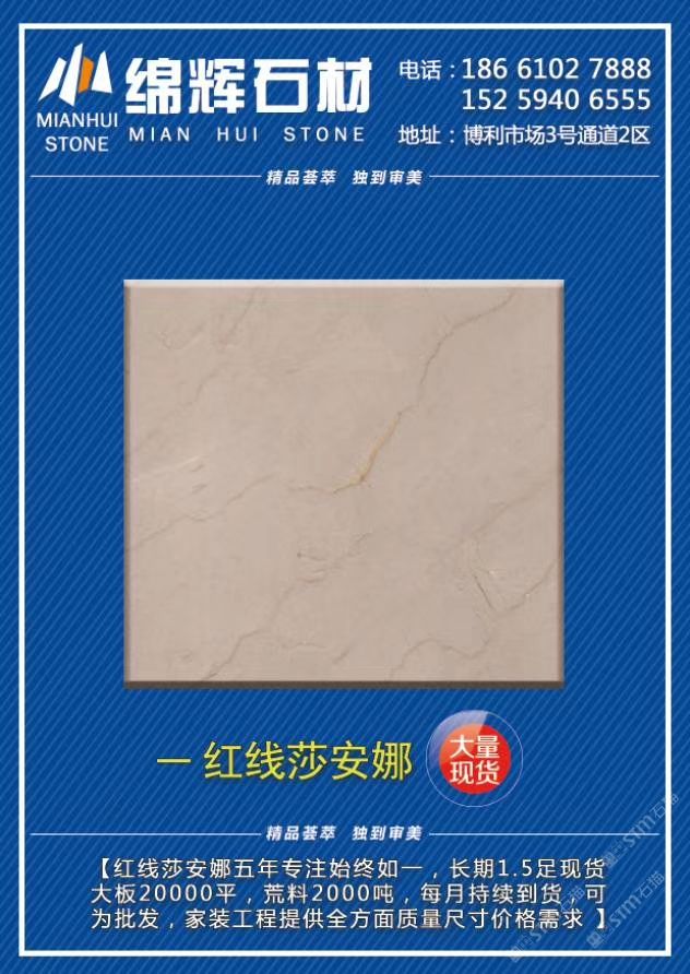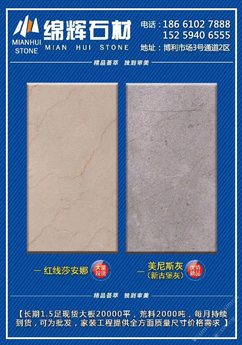 主營《紅線莎安娜》《美尼斯灰·新古堡灰》《金歐典》,每月持續(xù)到貨,日均庫存大板20000平,荒料2000噸。可為批發(fā),零售,工程單提供各種板面質(zhì)量/規(guī)格/價位需求!