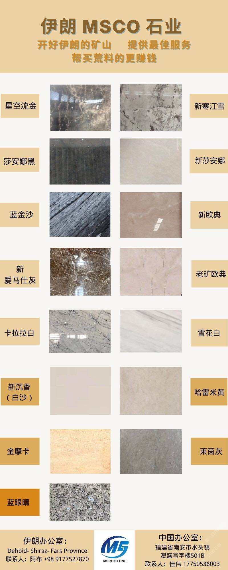 伊朗MSCO公司具備接近15年石材供應(yīng)及礦山經(jīng)營的豐富經(jīng)驗(yàn)。目前我司在伊朗經(jīng)營兩座自有的大理石礦山,此外多年以來已包過近十座礦山。MSCO公司主營產(chǎn)品種類包括大理石,石灰石,花崗巖。對于伊朗新老礦品種感興趣的企業(yè)老板們,歡迎隨時(shí)聯(lián)系咨詢我。