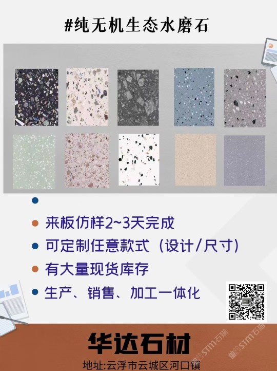 云浮市華達聚賢新型石材有限公司是一家以研發(fā)制造、加工、銷售新型人造石、天然石及其制品的企業(yè)。公司位于云浮市云安區(qū)石城鎮(zhèn)上洞村,占地面積30000平方米,年可生產(chǎn)人造無機石板材、自流平仿石材產(chǎn)品120萬平方。公司擁有原材料生產(chǎn)配套基地,保證日常生產(chǎn)所需的石料、石粉,有成品加工生產(chǎn)車間,有直營門店銷售,能為客戶提供從原材料選料、打樣定制、生產(chǎn)加工、工程配套等服務。華達聚賢新型石材無機水磨石、仿石材產(chǎn)品,屬于循環(huán)利用環(huán)保產(chǎn)品,所有原材料都是無機類選材,產(chǎn)品美觀實用,耐污耐磨,防火性能好,無異味,色彩斑斕,搭配元素多樣,深受國內(nèi)外設(shè)計師喜愛,適用于家具、商場、學校、酒店、地鐵站、政府機關(guān)、企業(yè)機構(gòu)等大型公共設(shè)施室內(nèi)外鑲貼,屬新型環(huán)保建材。公司通過GB/T19001-2016idtISO9001:2015質(zhì)量管理體系認證和GB/T24001-2016idtISO14001:2015環(huán)境管理體系認證。