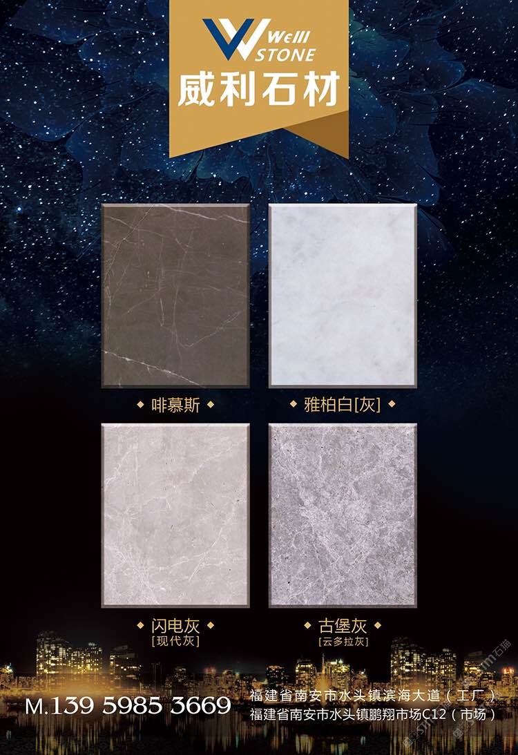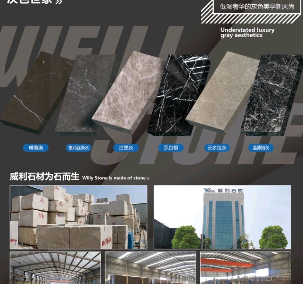 南安市威利石材有限公司成立于2008年,是一家集礦山開(kāi)采、加工、銷(xiāo)售、工程設(shè)計(jì)施工、進(jìn)出口貿(mào)易為一體的綜合型企業(yè)。我們不僅提供石材,更為您精心設(shè)計(jì)全套優(yōu)質(zhì)的石材解決方案。 威利石材專(zhuān)注于石材產(chǎn)品的礦山荒料直銷(xiāo)、大板加工、大板展銷(xiāo)、工程設(shè)計(jì)、工程配套施工服務(wù) 。公司主營(yíng)啡慕斯、黑白根、塞浦路斯灰、古堡灰,愛(ài)馬仕灰(溫德姆灰),雅柏白,閃電灰多種優(yōu) 質(zhì)品種。公司已成為一家集專(zhuān)業(yè)化、產(chǎn)業(yè)化和規(guī)?;墓こ滩牧喜少?gòu)、加工配套服務(wù)商。 威利石材以自己多年專(zhuān)業(yè)化和國(guó)際化的經(jīng)營(yíng),與國(guó)內(nèi)外礦山建立了良好的商業(yè)信譽(yù)和經(jīng)貿(mào)合作關(guān) 系,贏(yíng)得了國(guó)外礦山在中國(guó)區(qū)營(yíng)銷(xiāo)戰(zhàn)略的全力支持。 威利石材依靠豐富的礦山資源,先進(jìn)的管理、施工經(jīng)驗(yàn),堅(jiān)持“以市場(chǎng)為導(dǎo)向、以技術(shù)為主體、 以質(zhì)量為命脈、以效益為中心”,大膽探索,在技術(shù)進(jìn)步、生產(chǎn)經(jīng)營(yíng)、企業(yè)管理、產(chǎn)品質(zhì)量、售后服務(wù)等 方面始終走在行業(yè)的前列。并在信守“質(zhì)量為準(zhǔn)、信譽(yù)優(yōu)等、服務(wù)為上”的企業(yè)精神指導(dǎo)下,產(chǎn)品暢銷(xiāo)世 界各地,深得消費(fèi)者的信賴(lài)和贊譽(yù)。我們時(shí)刻把握時(shí)代脈搏,走在市場(chǎng)前沿,揮灑石材文化,增添人類(lèi)輝煌。多年來(lái)我們一直致力于服務(wù)質(zhì)量的提高?!邦櫩蜑樯稀薄ⅰ白非髨A滿(mǎn)”已經(jīng)融入到公司的企業(yè)文化、經(jīng)營(yíng) 理念當(dāng)中,并且在產(chǎn)品生產(chǎn)、過(guò)程服務(wù)、售后追蹤等具體工作中得到落實(shí)。 我們的追求——集世界美石,為中國(guó)添彩!\