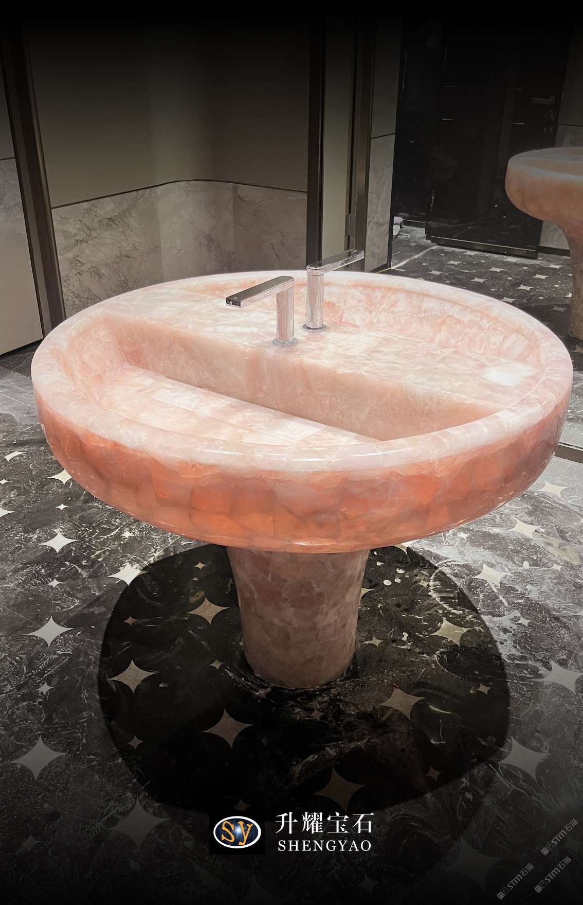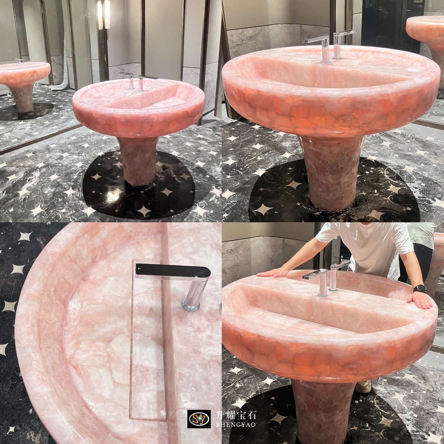 發(fā)布信息: 這是一款用粉水晶制作而成的洗手臺,根據(jù)客戶需求定制尺寸及形狀,