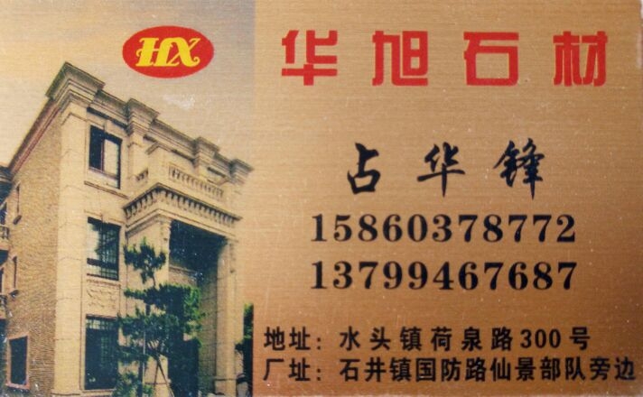 華旭石材工藝 聯(lián)系人:占先生    158****8772 查看 137****7687 查看 主營(yíng)范圍: 異型加工、石材工藝品、 企業(yè)地址:福建南安水頭鎮(zhèn)延平路口;石井鎮(zhèn)國(guó)防路仙景部隊(duì)旁邊