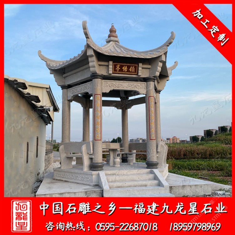 發(fā)布信息: 大理石涼亭廠家選九龍星石業(yè)18959798969。九龍星石業(yè)從事石雕行業(yè)二十多年,常年批發(fā)石雕涼亭、石亭子,款式多樣,價格合理,工期快。 石雕涼亭我們也成它為石材涼亭、石頭涼亭、石亭子。石雕涼亭樣式很多九龍星石業(yè)小編總結(jié)大概可以分為兩種:仿古中式石雕涼亭和簡約歐式風(fēng)格石雕涼亭。 石雕涼亭廠家在加工制作時選用的材料多為大理石、芝麻黑、芝麻白、本山石等石料。 “亭”與停同音,停留也,人們休憩的場所。涼亭在我國古代已經(jīng)存在。周代時期,那時候人們建造涼亭是在邊防要塞地區(qū),以小堡壘的形式。到魏晉南北朝時期,建造為休憩的亭子,也是大約從這時候涼亭做為一處休憩的場所走進(jìn)人們的生活。