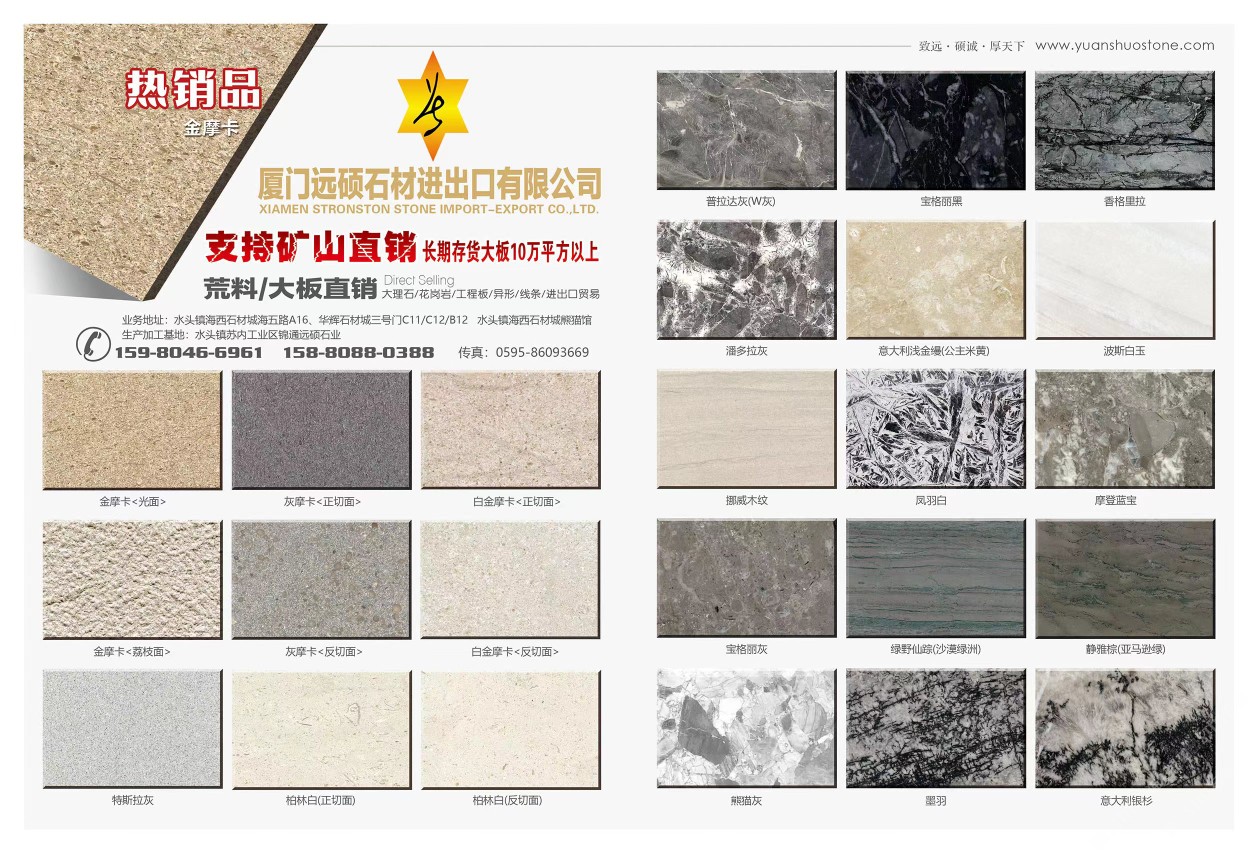 廈門遠(yuǎn)碩石材進(jìn)出口有限公司 聯(lián)系人:王先生    158****0388 查看 0595-****3669 查看 主營(yíng)范圍: 大板批發(fā)、荒料、礦山、石材外貿(mào)、異型加工、大理石加工、石材工程資質(zhì)企業(yè)、薄板復(fù)合板加工、物流、水刀拼花、 企業(yè)地址:福建南安水頭鎮(zhèn)海西石材城海西五路A16、A17