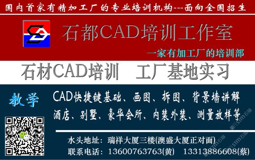 發(fā)布信息: 俗話說:“山無石不險,水無石不清,園無石不秀,居無石不雅,在水頭這個以石為主的地方---石都, 石都CAD培訓工作室 一家有精加工廠的培訓工作室 招生中... 地址:奧盛大廈對面瑞祥大廈三樓,聯(lián)系電話:13600763763、136-2599-0077 我們有理想、有激情、團隊專業(yè)、前景廣闊---只等你來大顯身手。