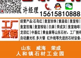 榮成市浩大石材廠主營產(chǎn)品:石島紅,皇室珍珠,紫晶鉆,皇室玫瑰,皇室啡,中國棕,龍須紅G3787,白麻,皇室棕鉆,石島紅(新8號),石島紅(7號),石島紅(老8號),新石島紅(光面),新石島紅(荔枝面),皇室珍珠1,皇室棕企業(yè)地址:山東威海榮成市人和鎮(zhèn)石材工業(yè)園